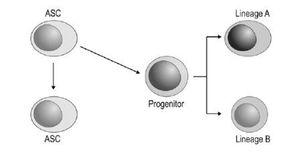 [[ملف: | [[ملف:Sc.jpeg|thumb|الشكل 1. الانقسام غير المتناظر في الخلايا الجذعية. خلية جذعية كهلة يمكن أن تنقسم لتوليد خلية جذعية كهلة أخرى وخلية منقوصة compromised لتتمايز إلى سلالات خلوية معينة (سلف)]] | ||