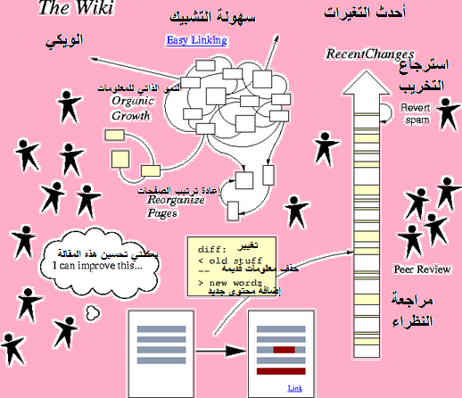 • تبسط Wiki عملية تحرير المحتويات، فكل صفحة تحوي رابطاً لتغيير محتوياتها، فإذا أراد شخص ما تغيير محتويات الصفحة فعليه أن يضغط على الرابط وسيظهر له نموذج لتحرير المحتويات، وعندما ينتهي من إضافة وتعديل ما يريد عليه أن يضغط الزر لإرسال التعديلات وستظهر الصفحة كما قام بتحريرها.