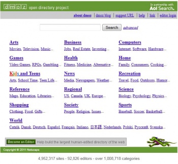 مشروع الدليل المفتوح لمواقع الإنترنتدليل يحوي حوالي خمسة ملايين موقع على الإنترنت مؤرشف بطريقة يدوية تعتمد على محررين متطوعين يزيد عددهم عن 90000 محرراً