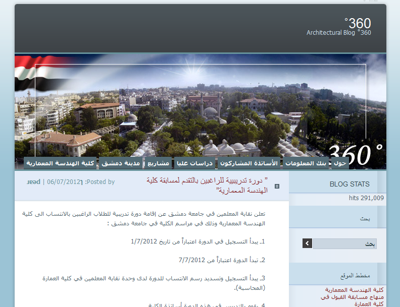 موقع الهندسة المعمارية مدونة متعددة المحررين يقوم عليها أساتذة من كلية الهندسة المعمارية من جامعة دمشق، ويعمل منذ 2008 وعدد الزيارات بمئات الآلاف وفيه خانة للبحث